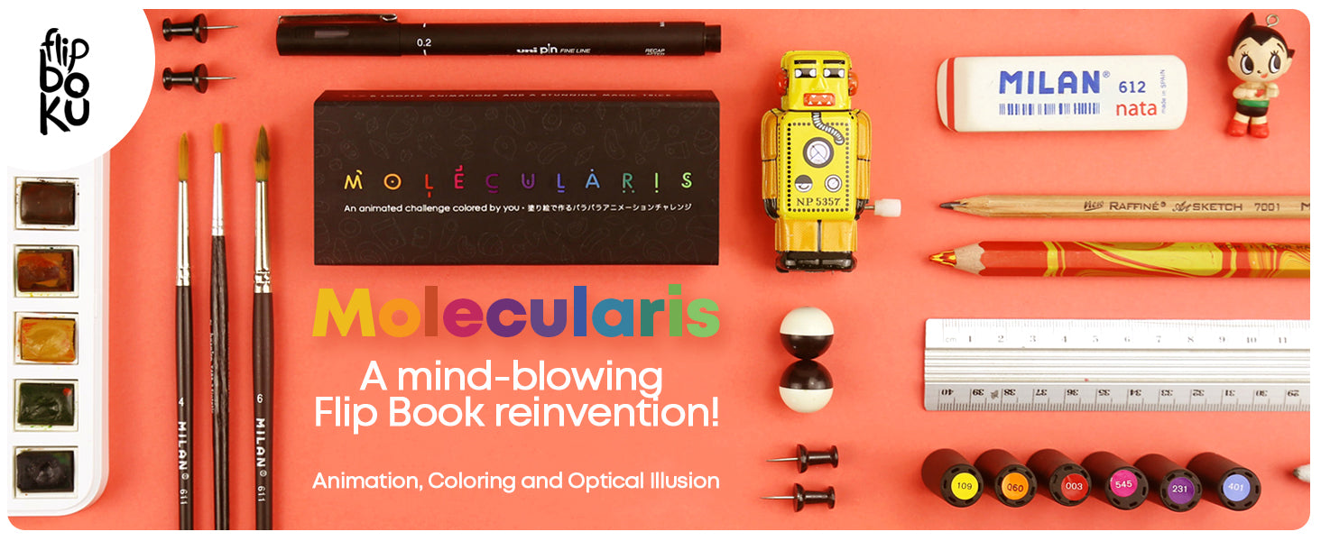 You are into coloring but don't want to use the usual flat paper? Then Molecularis is a great fit. First, color each page of the flip book with your favorite coloring technique and then flip the pages and watch the animations come to life.