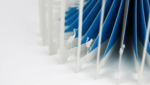 Yusuke Oono, nacido en Alemania y formado como arquitecto, ha diseñado una sorprendente vuelta de tuerca al libro pop-up. Como sugiere su título, al desplegar este pequeño libro de forma circular se obtiene una escena panorámica de 360 grados de siluetas superpuestas. El monte Fuji se muestra en toda su majestuosidad, rodeado de nubes onduladas y un ardiente sol redondo, y con graciosas grullas de corona roja posándose en sus laderas.